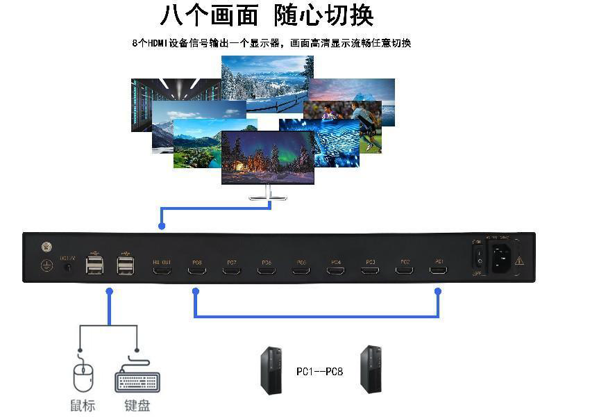 可级联多台设备, 8口可以连接64台电脑统一操作